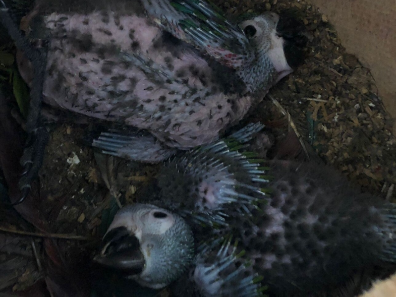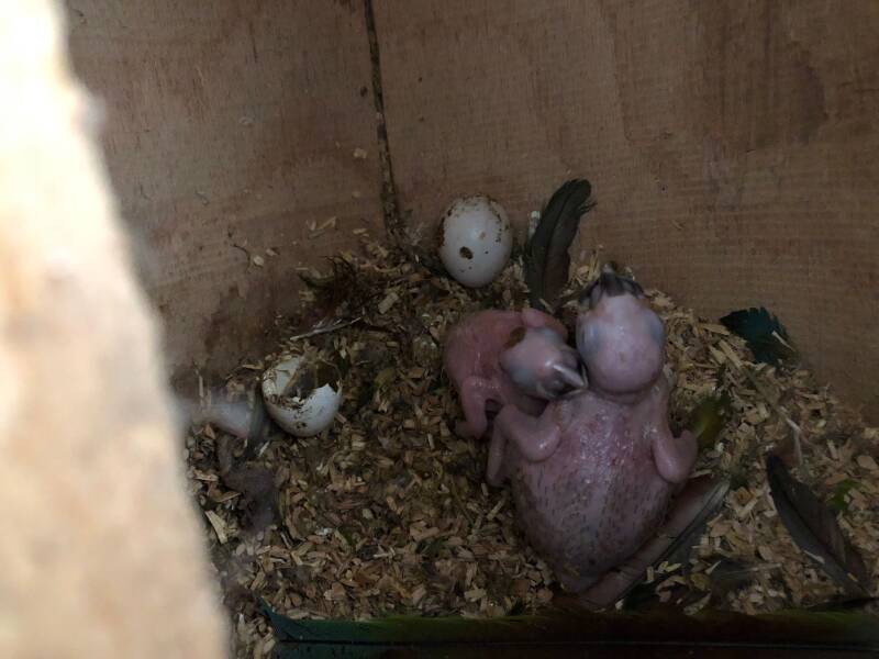 Op 1 augustus hoorde ik bij het voeren gepiep vanuit het blok. Er moest dus ten minste één jong geboren zijn. Omdat de vogels zo driftig waren en ik niet wilde dat de pop in de frustratie de jongen wat aan zou doen heb ik mezelf ingehouden en de nestcontrole nog even uitgesteld. Een week later was mijn beredenatie dat de eventuele jongen al wat flinker zouden moeten zijn en besloot ik toch in het nest te kijken. Er bleken twee mooie jongen in te liggen die toch zeker een dag of 10 oud moesten zijn, en die ik toen geringd heb met een 9 mm ring. Ook lag er nog een uitgedroogd maar bevrucht ei in. In de weken erna groeiden de jongen mooi uit. De vogels aten rond eind november, dus met 4 maanden oud voldoende zelfstandig.