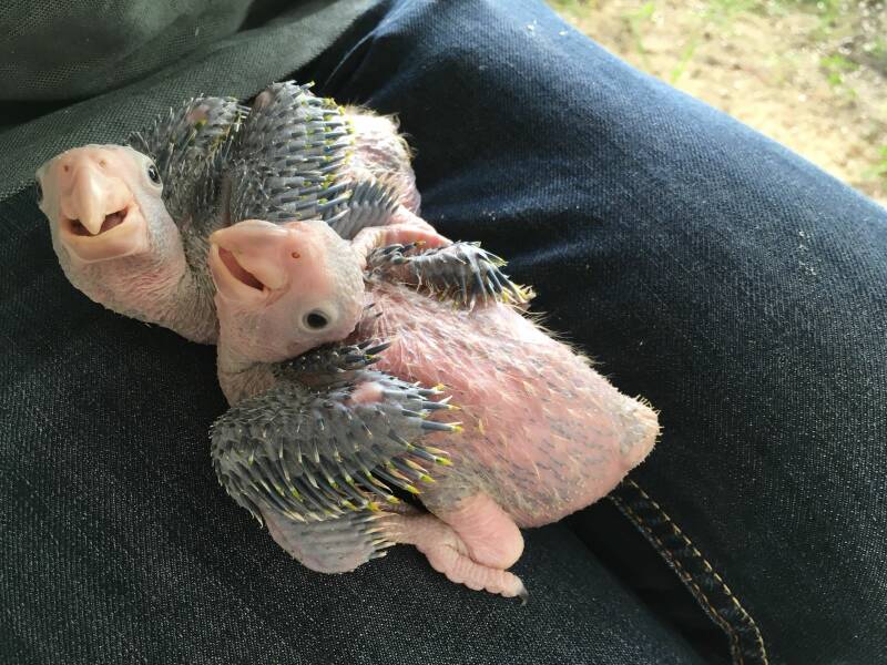 Foto's, vlnr: aangepikt ei, 1 dag oud, 1 week oud. Audio: uitpikkende groenwangamazone