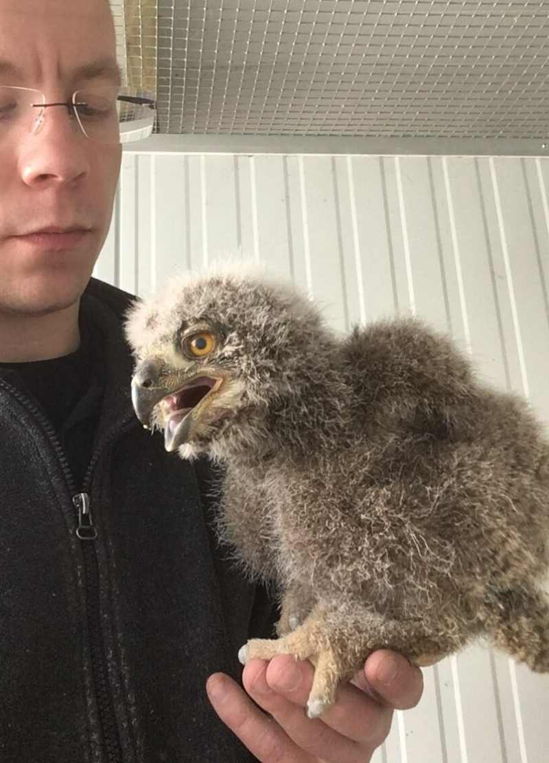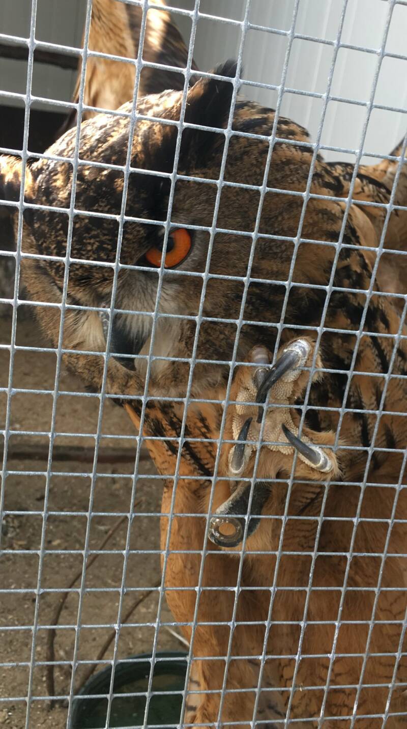 Op bestelling van een klant kocht ik in februari 2018 een koppel Oehoes van 6 jaar oud. De man was erg tam en kon ik zo op de hand laten stappen zonder handschoen. Het wijf was niet tam. De klant had (niet geheel volgens afspraak...) zijn kooi nog niet klaar en de Oehoes moesten daarom enkele weken bij mij blijven. Ik voerde ze eendagskuikens, muizen, ratten, hamsters, kwartels, konijnen, kip en cavia. Opvallend is dat ze hamster en cavia voor mijn idee minder graag pakken dan het andere voedsel. Regelmatig nam ik de tamme man op de hand. Leuk om even te hebben zitten dus.
