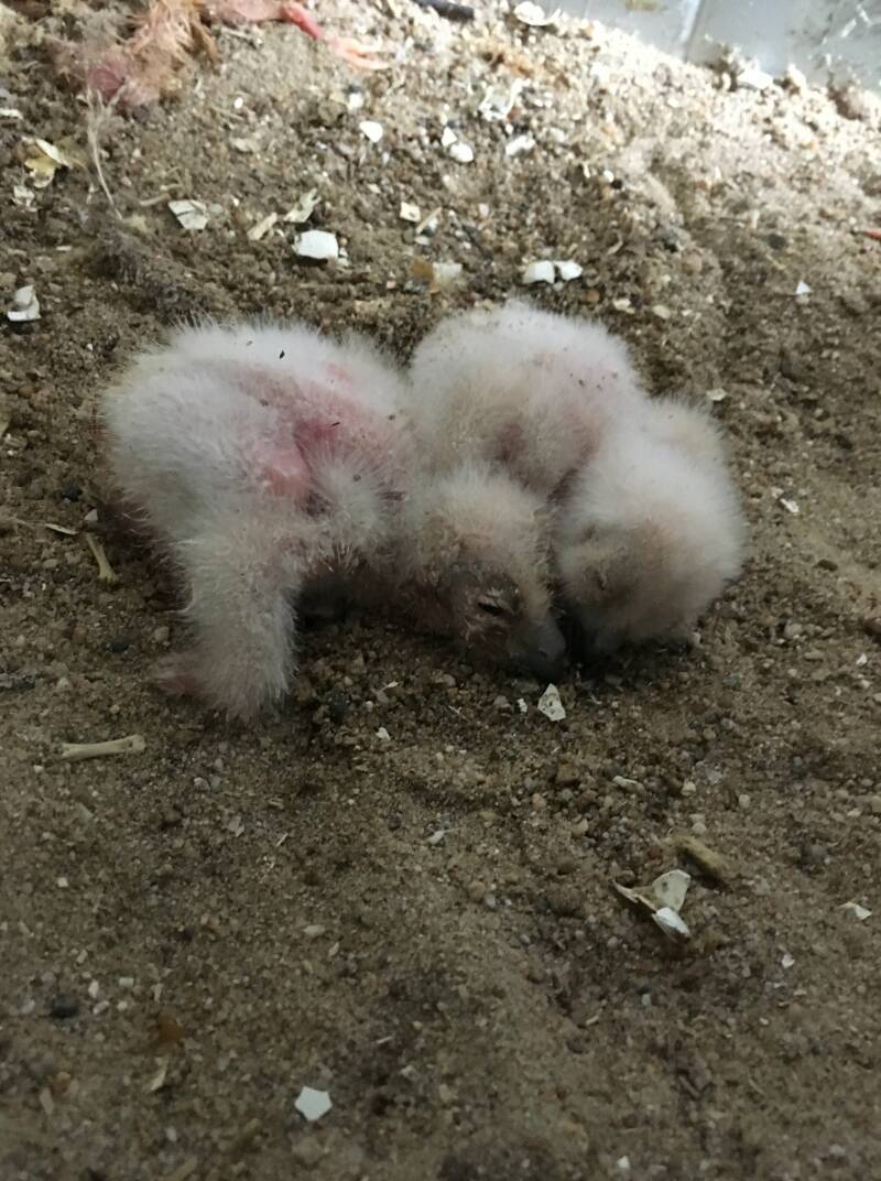 Op 29 april waren beide uiltjes uit het ei gekomen. Wanneer ik voerde ging de man meteen met zijn nieuwe 'prooi' naar het nest om het aan te bieden waarbij hij typisch klokkende geluidjes maakte... om duidelijk te maken aan het vrouwtje dat hij het was? Na een paar dagen merkte ik dat hij (of het wijf) ook een voorraadje aanlegde aan de rand van de nestkuil die ze gemaakt hadden.